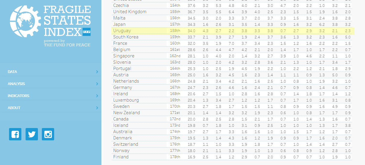 Uruguay con 34 puntos en 120 (“0” es menos frágil) se ubica como el país mejor ubicada a nivel latinoamericano y el 21° a nivel mundial.